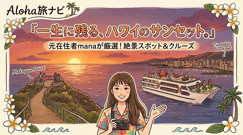 ハワイ旅行のハイライトといえば、なんといっても美しいサンセットではないでしょうか。オレンジ色に染まる空と海を眺める時間は、心に残る最高の思い出になります。でも、初めての方や久しぶりの方は、「どこで見るのが一番綺麗なの?」「クルーズは予約... -