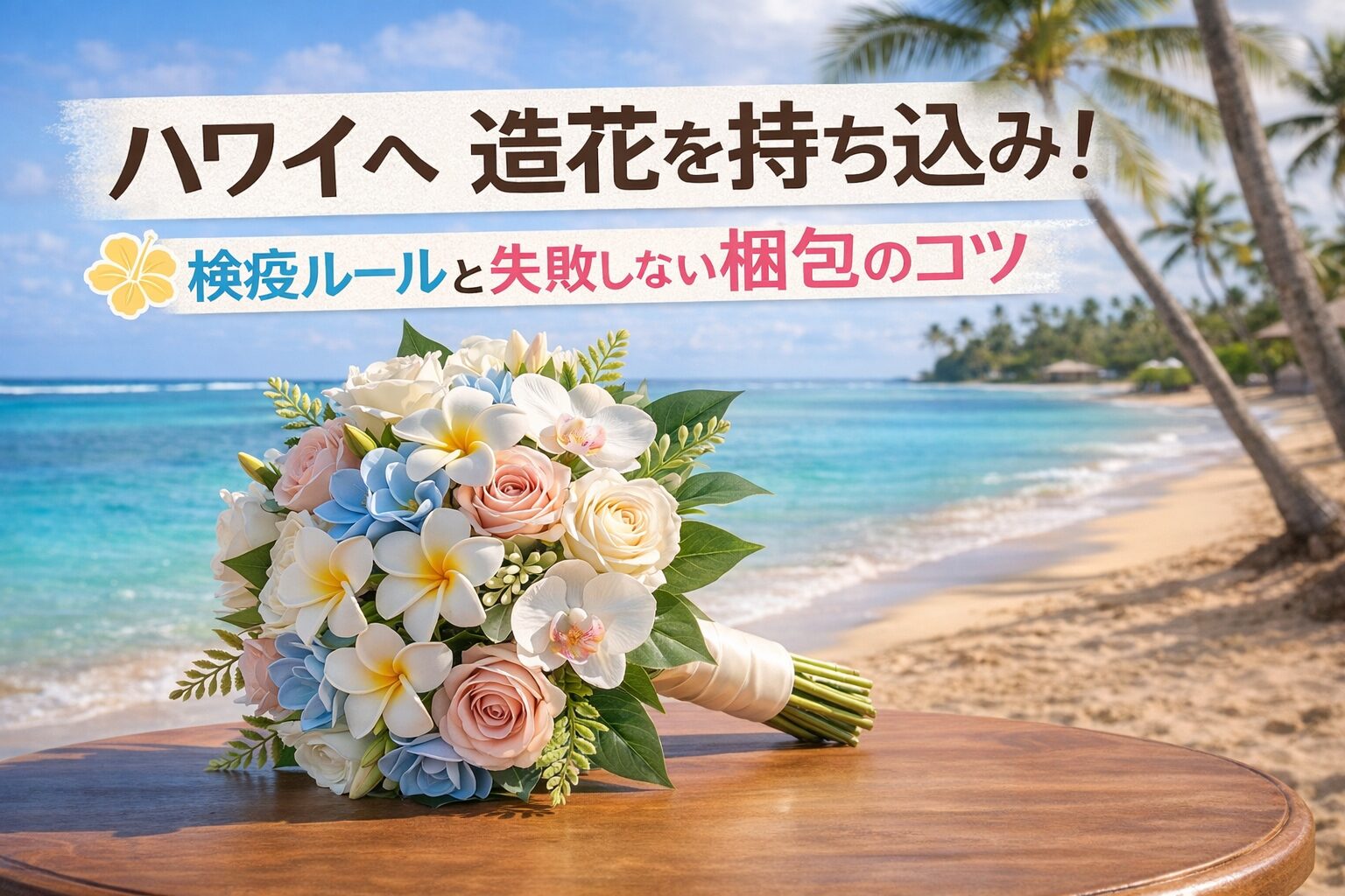 せっかく日本でお金をかけて作ったこだわりのブーケでも、ハワイの自然を守るルールの前では例外は認められません。ブーケをオーダーする際は、必ずクリエイターさんに「ハワイに持ち込むので、素材はすべて100%人工物(アーティフィシャル)だけで構成してください」と念押ししておきましょうね。安全な素材だけで作られたブーケこそが、ハワイへの最強の通行手形になるんです。