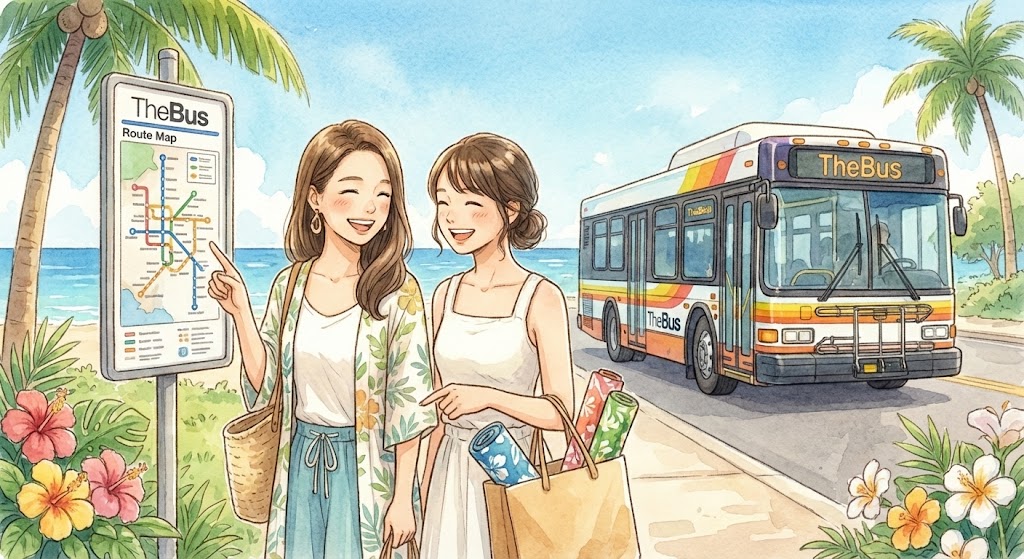 - トロリー・バスの場合: ワイキキトロリー(ピンクラインなど)を利用する場合、「ワイキキ・ショッピング・プラザ」などの停留所で下車し、そこから徒歩で移動するのがスムーズです。TheBusを利用する場合も、クヒオ通り(Kuhio Ave)のバス停から海側へ1ブロック歩くだけです。